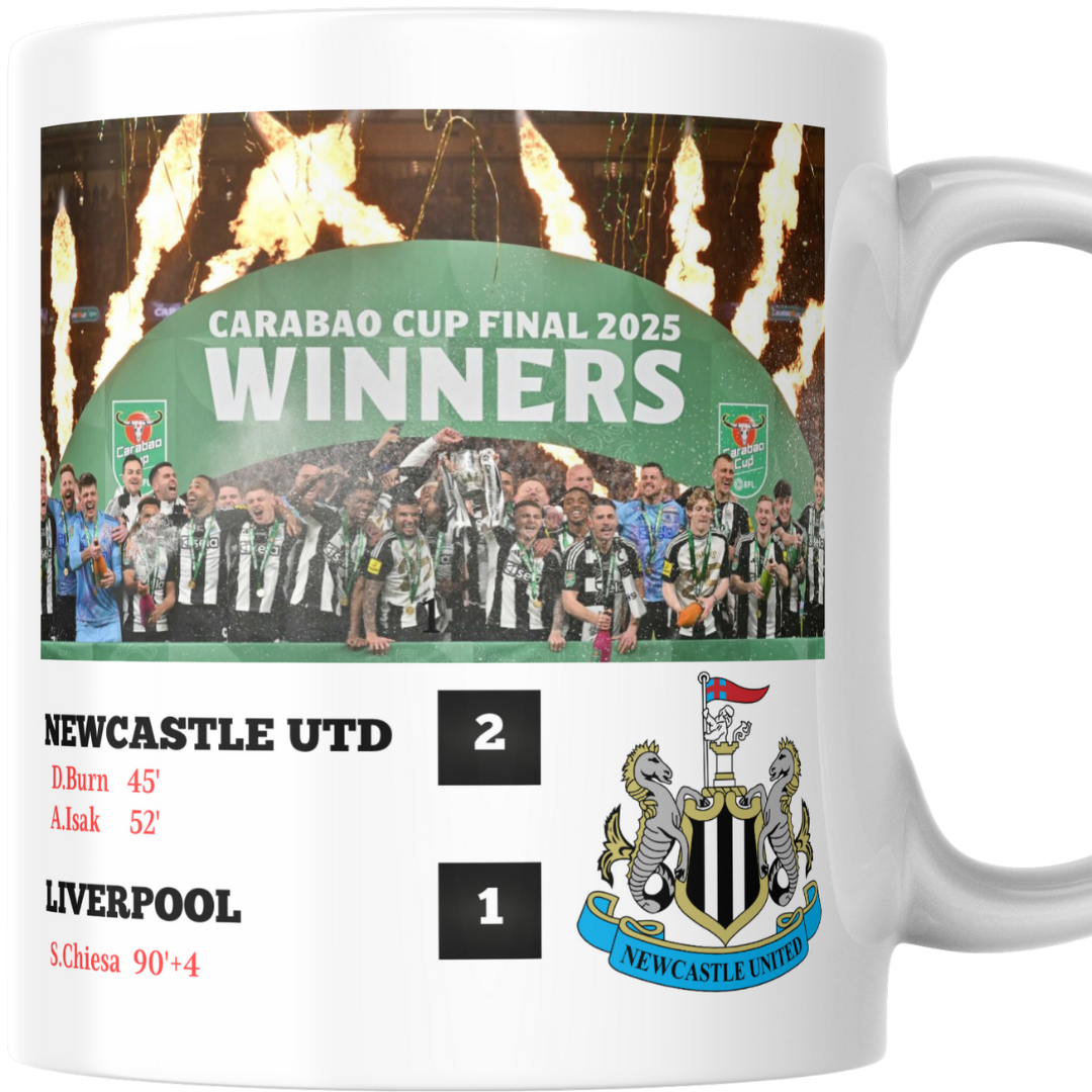 History made. Celebrate Newcastle United’s triumphant 2025 Carabao Cup victory with this bold commemorative mug. Whether you were at Wembley or shouting at the telly, this 11oz white ceramic mug lets you relive the glory with every sip. Dishwasher and microwave safe — because true Geordie pride deserves a proper cuppa.