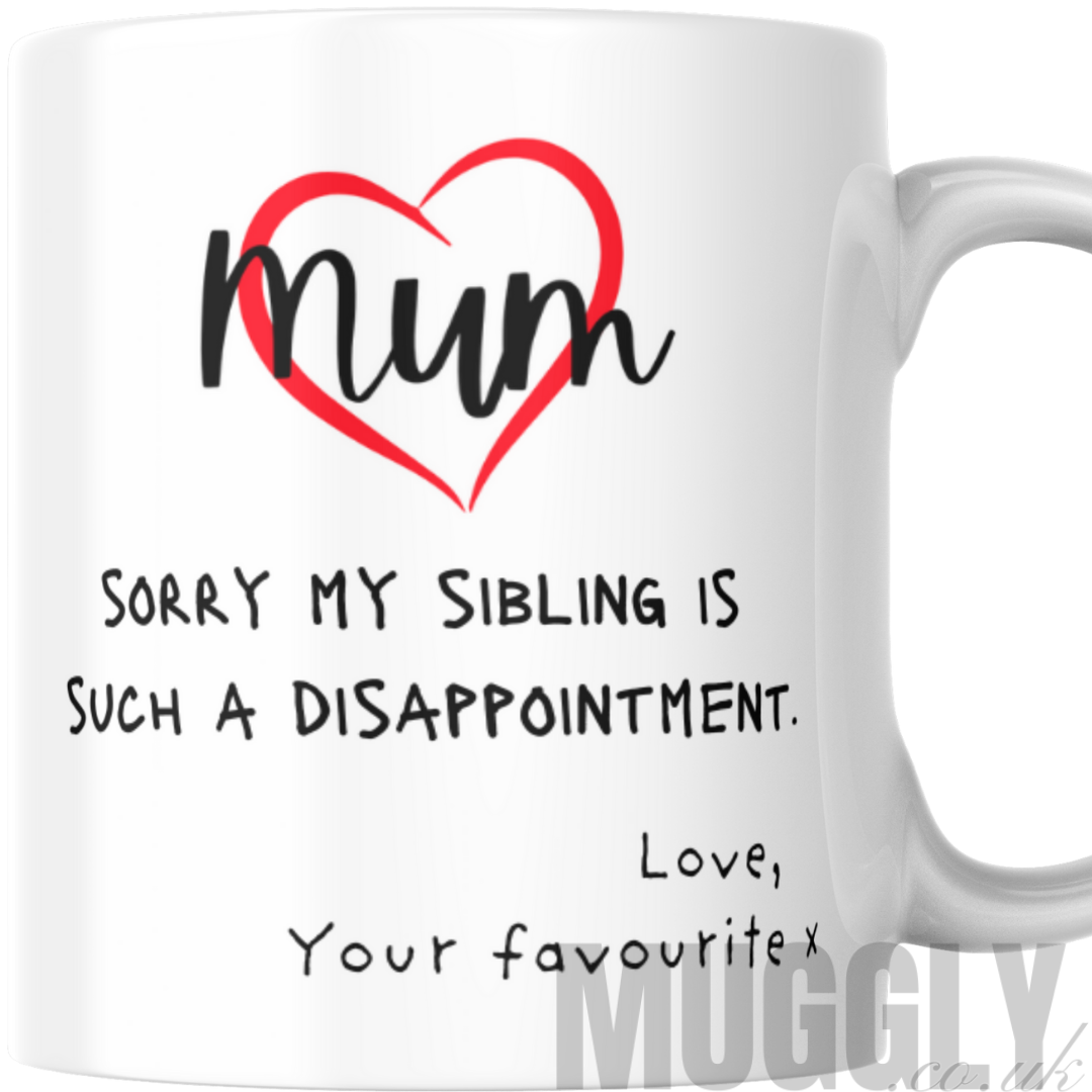 This mug is the perfect mix of humour and sibling rivalry! The "Sorry my sibling Is a disappointment" mug is a fun and cheeky way to poke fun at family dynamics!